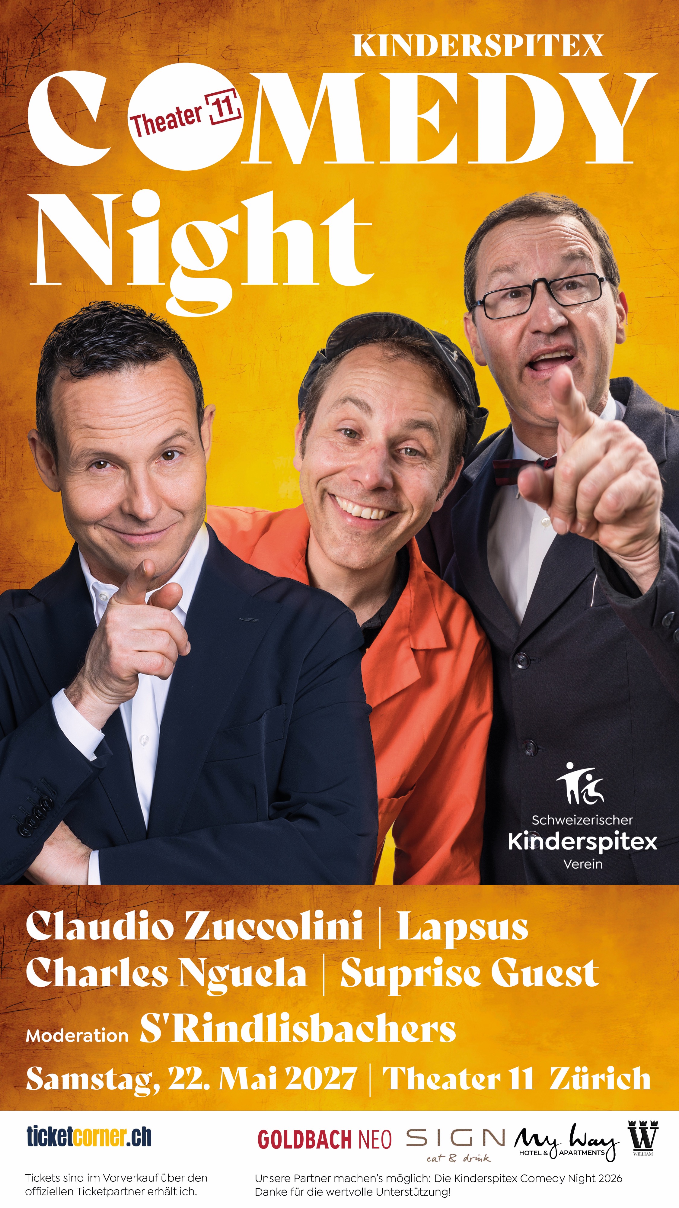 Am Samstag, 22. Mai 2027 verwandelt sich das Theater 11 in Zürich in eine Comedy-Bühne der Extraklasse. Die Kinderspitex Comedy-Night bringt hochkarätige Comedians zusammen – und das für einen ganz besonderen Zweck: Alle Einnahmen kommen dem Schweizerischen Kinderspitex Verein zugute, der Familien mit schwer kranken und beeinträchtigten Kindern unterstützt.